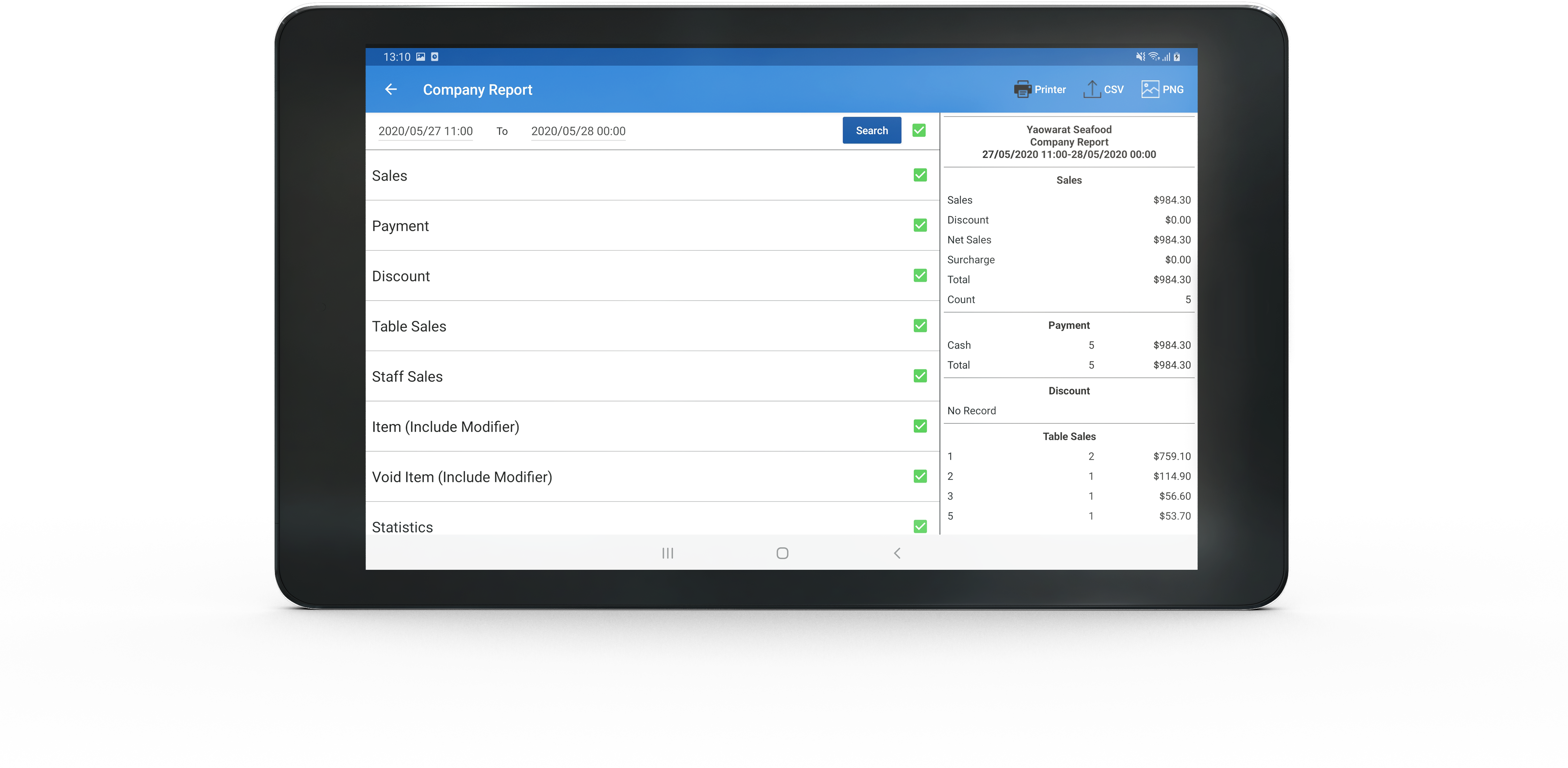 Export reports that gives you great insights into every aspect of your business from total sales to top selling menu items, category mix and waiter performance.